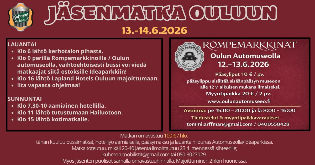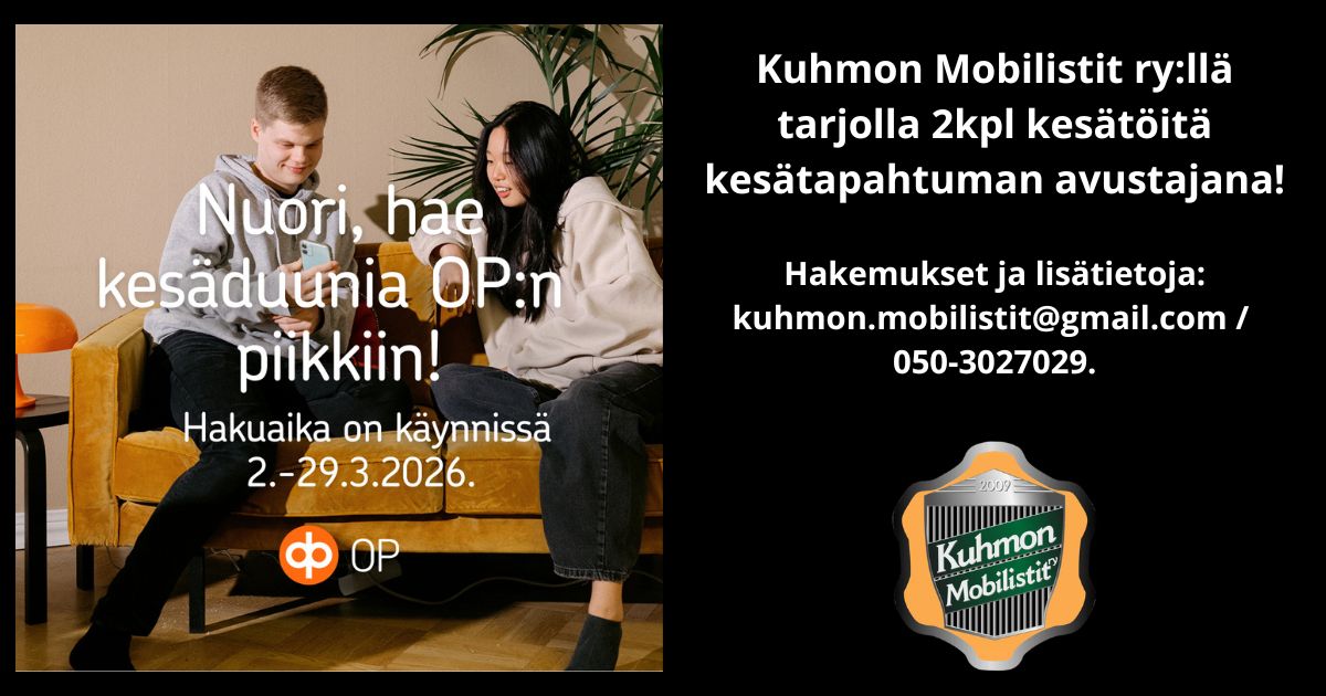 Sihteeri/Rahastonhoitaja: Tanja Kinnunen, kuhmon.mobilistit@gmail.com, puh. 050 302 7029